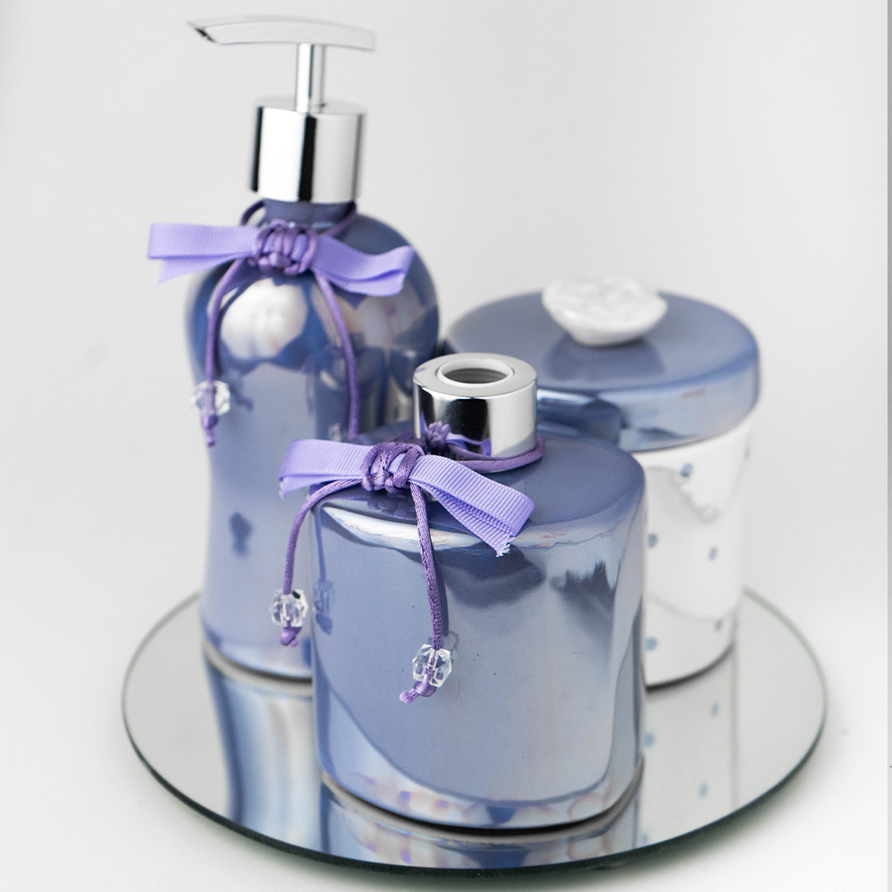 Kit “Delicadeza Espelhada”: Conjunto premium com bandeja redonda espelhada, porta sabonete líquido, porta algodão em cerâmica lilás e difusor de varetas. Sofisticação, organização e bem-estar em um design moderno e encantador para o enxoval.