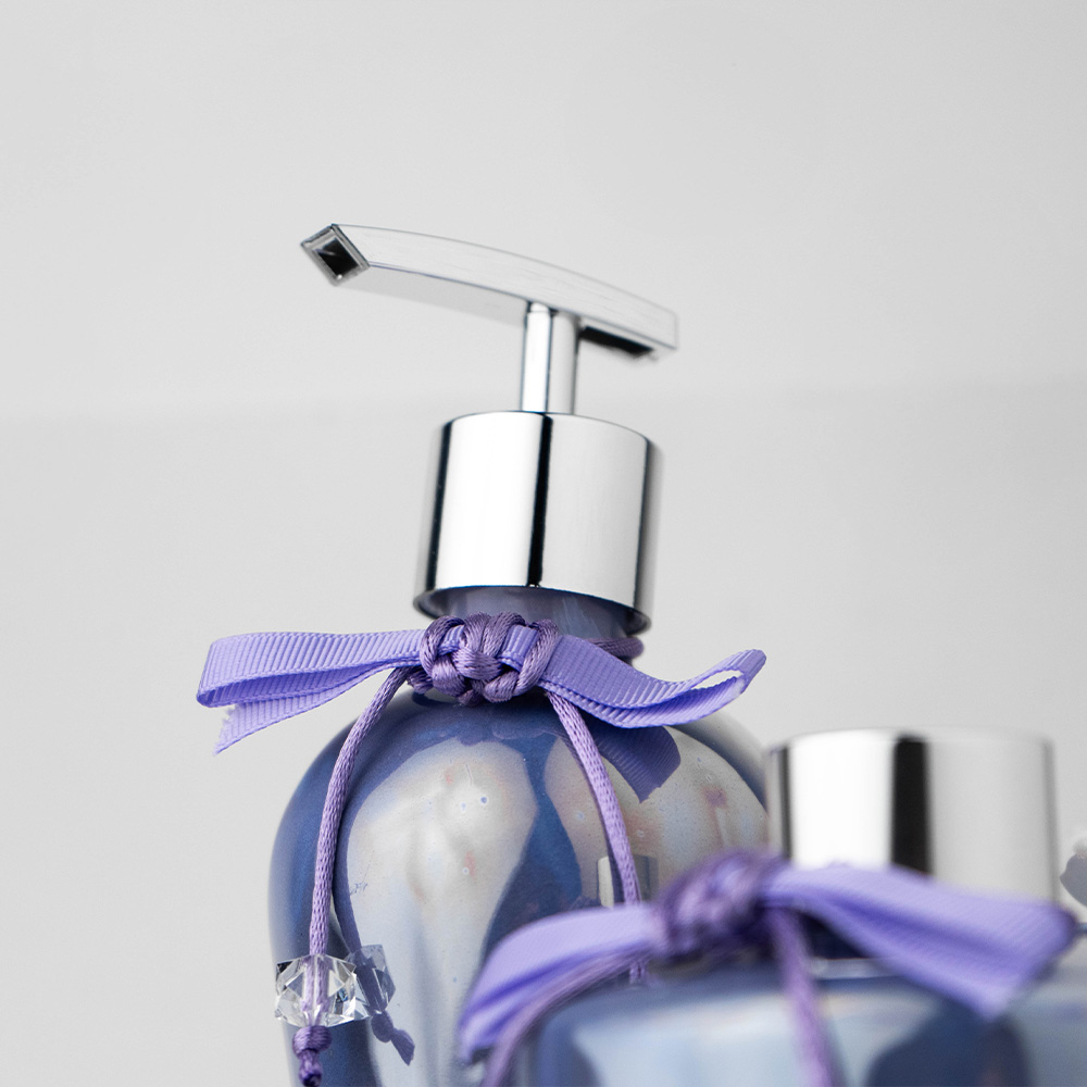 Porta Sabonete Líquido/Álcool Gel: Higiene prática e rápida em um frasco de cerâmica lilás com acabamento impecável.