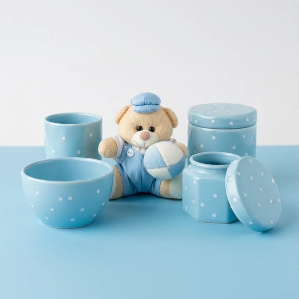 Transforme os momentos de cuidado com seu bebê em experiências de puro amor e tranquilidade com o Kit Nuvem de Carinho Azul. Este conjunto de 7 peças em porcelana azul celeste com poá branco foi especialmente criado para pais que valorizam organização, praticidade e beleza em cada detalhe do universo do seu pequeno príncipe.