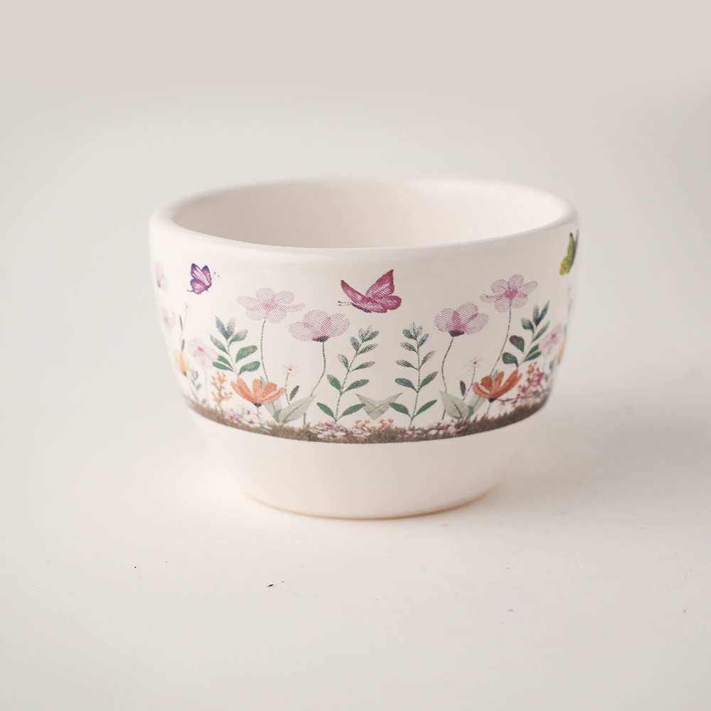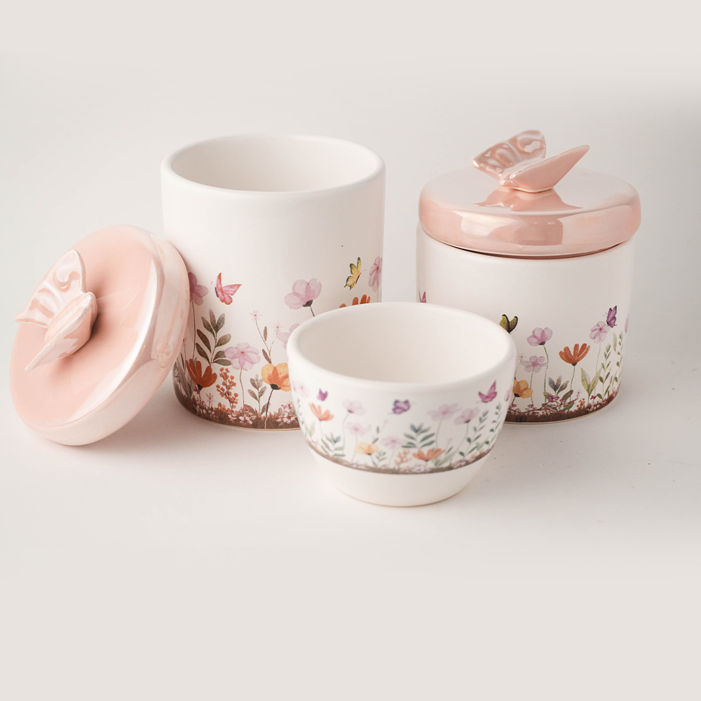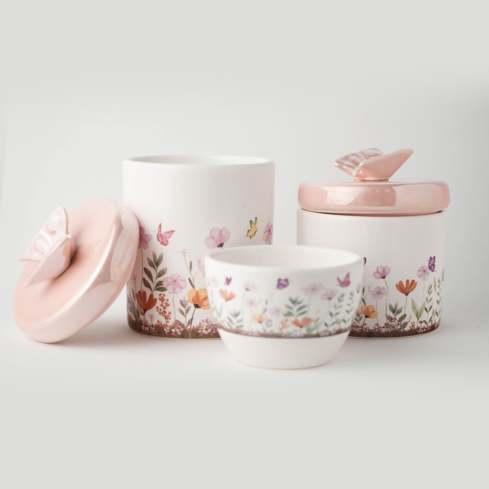 Estampa Jardim Minimalista: Os recipientes brancos exibem ilustrações finas de flores e borboletas, criando uma unidade visual que remete à paz de um jardim ensolarado.