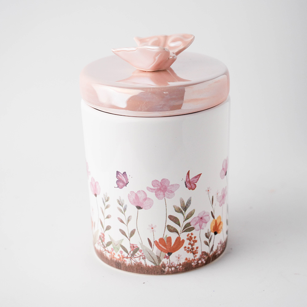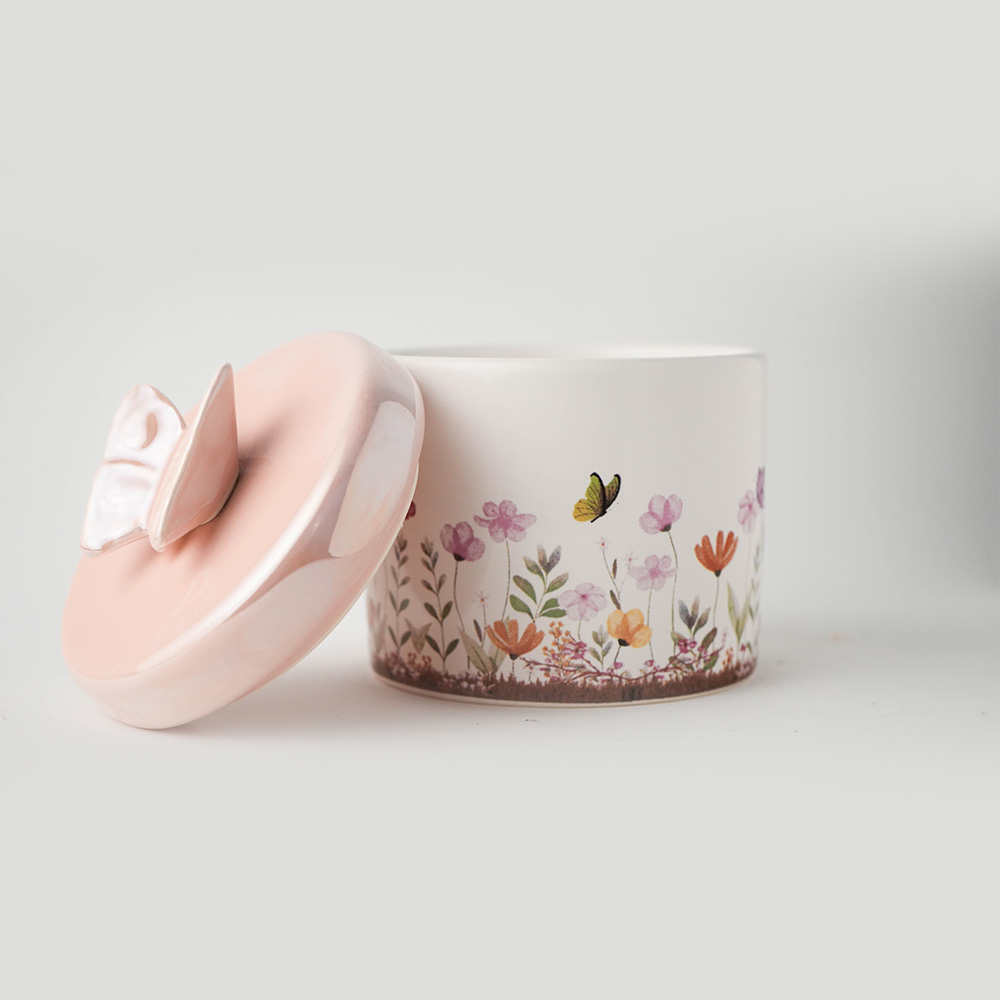 Puxadores de Borboleta: O grande diferencial artístico. As tampas do porta algodão e cotonete são coroadas com borboletas delicadas, simbolizando transformação e doçura.