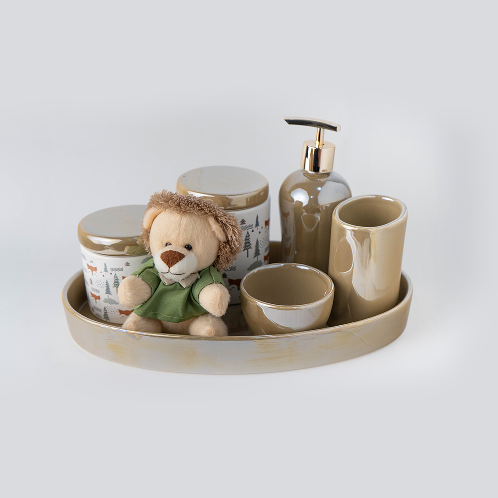 Kit Higiene “Aventura no Bosque”: 7 peças em cerâmica com estampa de raposinha e um adorável leãozinho decorativo. Inclui bandeja, porta sabonete líquido e potes organizadores. O charme lúdico da floresta com a organização que o quarto do bebê precisa.