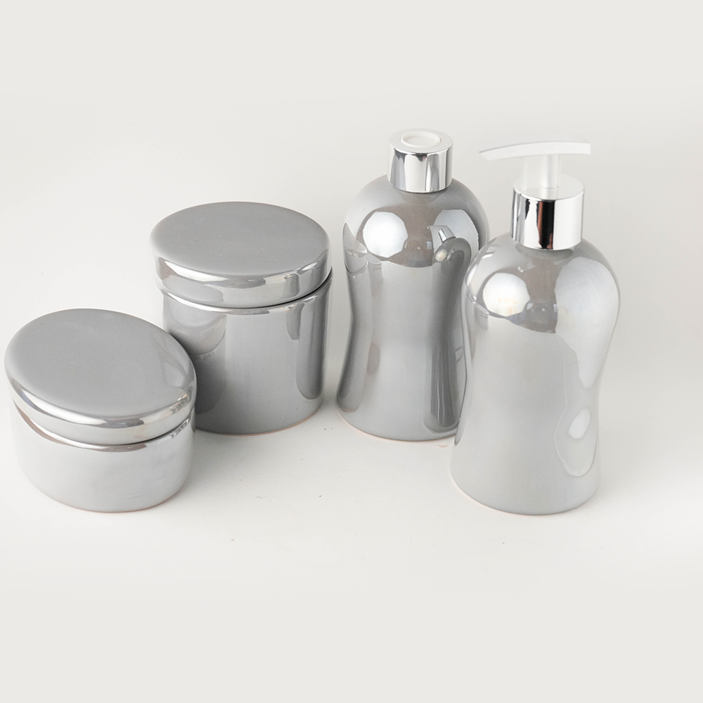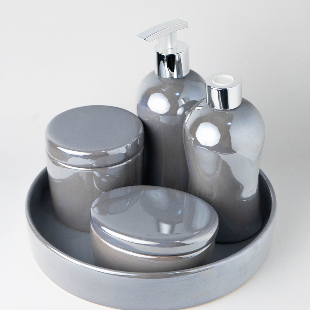 Kit Lavabo Premium: 5 peças em cerâmica cinza grafite. Inclui bandeja redonda, porta sabonete líquido, porta algodão, difusor e um exclusivo porta-joias. Design moderno, versátil e sofisticado para uma bancada organizada com luxo.