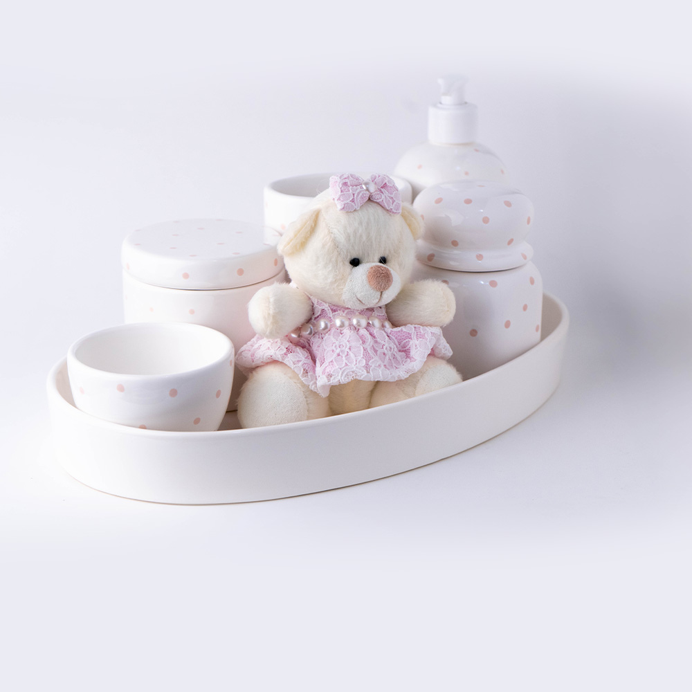 Kit Higiene “Minha Menina”: 7 peças em cerâmica branca com delicado poá rosa. Inclui bandeja, porta sabonete líquido, porta algodão, porta cotonete, pote funcional e um ursinho decorativo. O equilíbrio perfeito entre organização e ternura para o enxoval.
