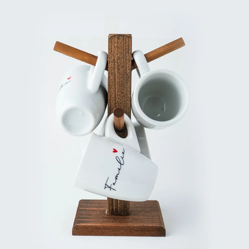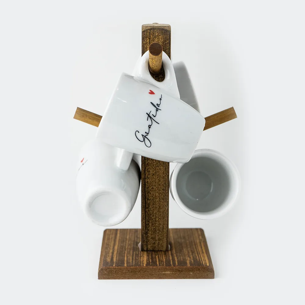 ✅ 4 Canecas tulipa pequenas brancas ✅ Caligrafia manuscrita delicada ✅ Palavras: Fé, Família, Amor, Gratidão ✅ Mini corações vermelhos em cada uma ✅ 1 Suporte de madeira estilo varal ✅ 4 Ganchos para pendurar ✅ Design criativo e funcional ✅ Conjunto completo pronto para usar ✅ Embalagem encantadora para presente