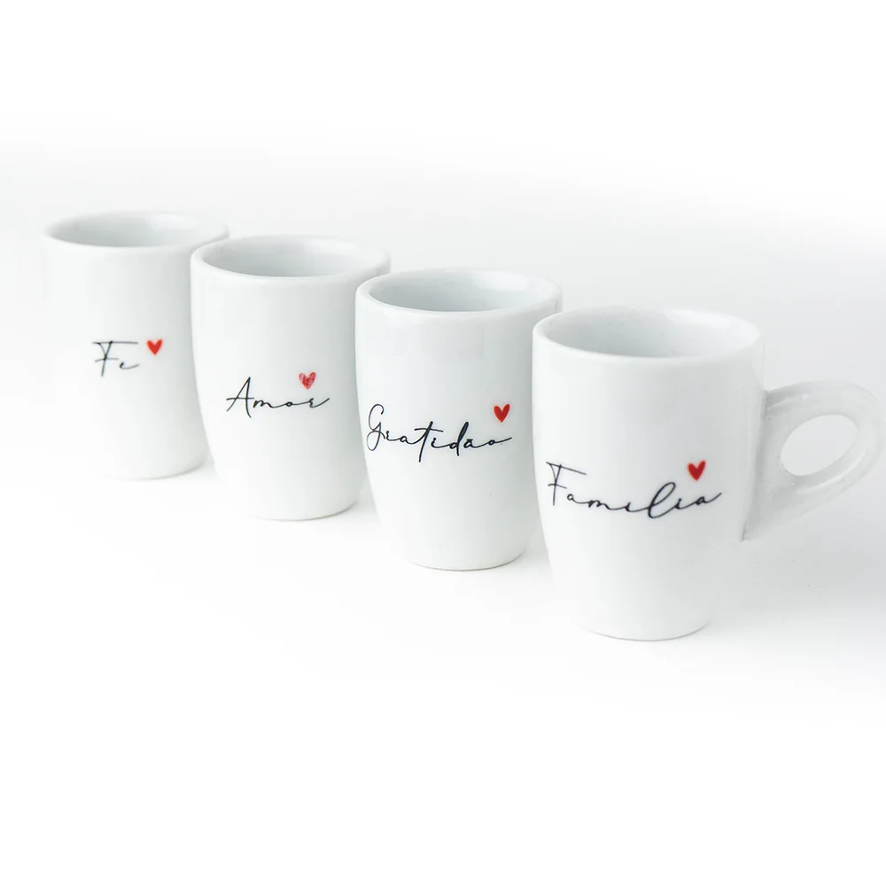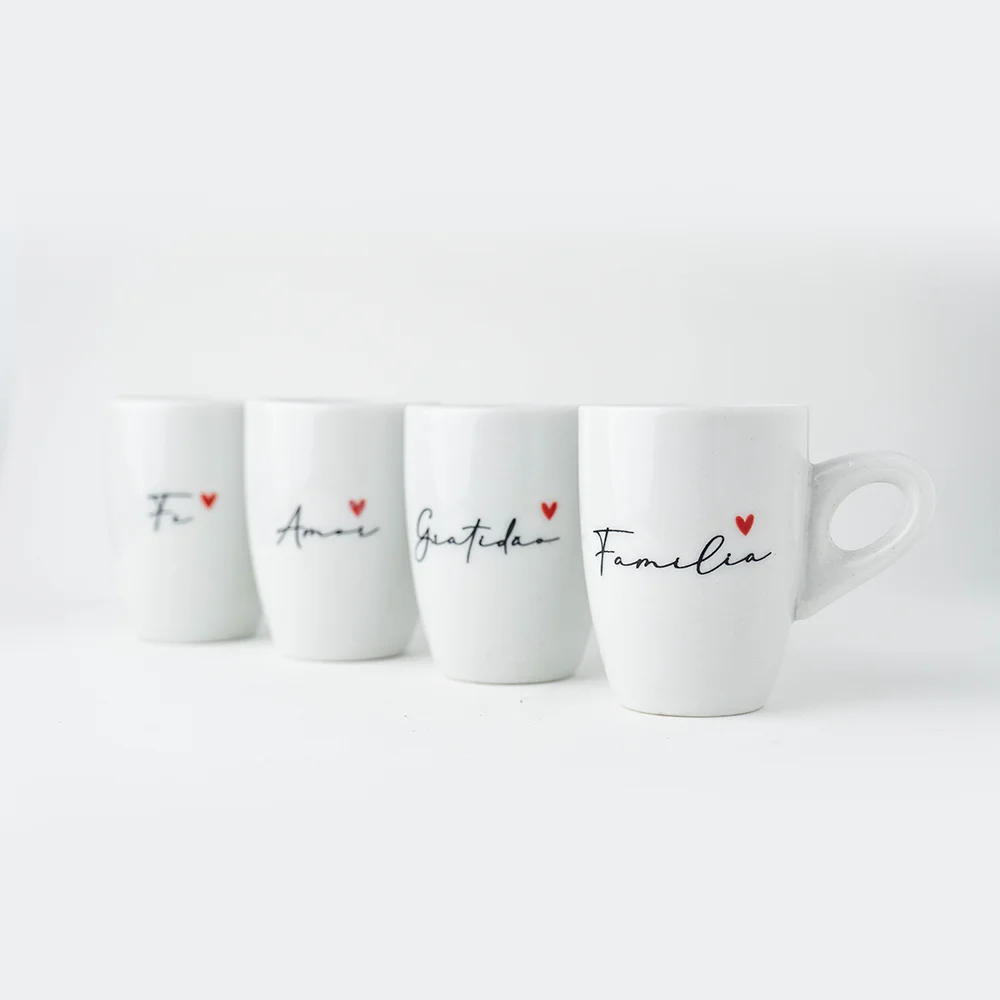 Cada caneca é um verso de amor e gratidão. Com design tulipa compacto em branco puro, decoradas com caligrafia delicada e mini corações vermelhos, este quarteto transforma a rotina do café em um momento de conexão com o que realmente importa.
