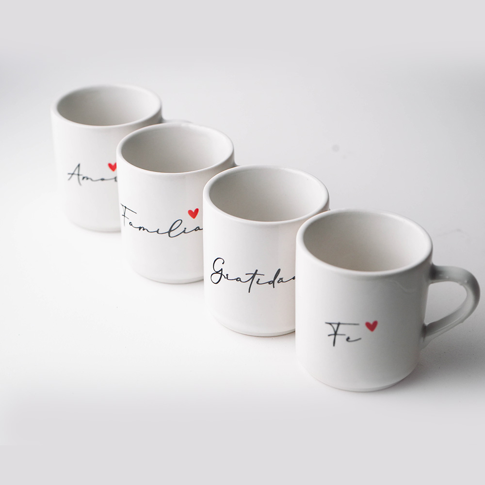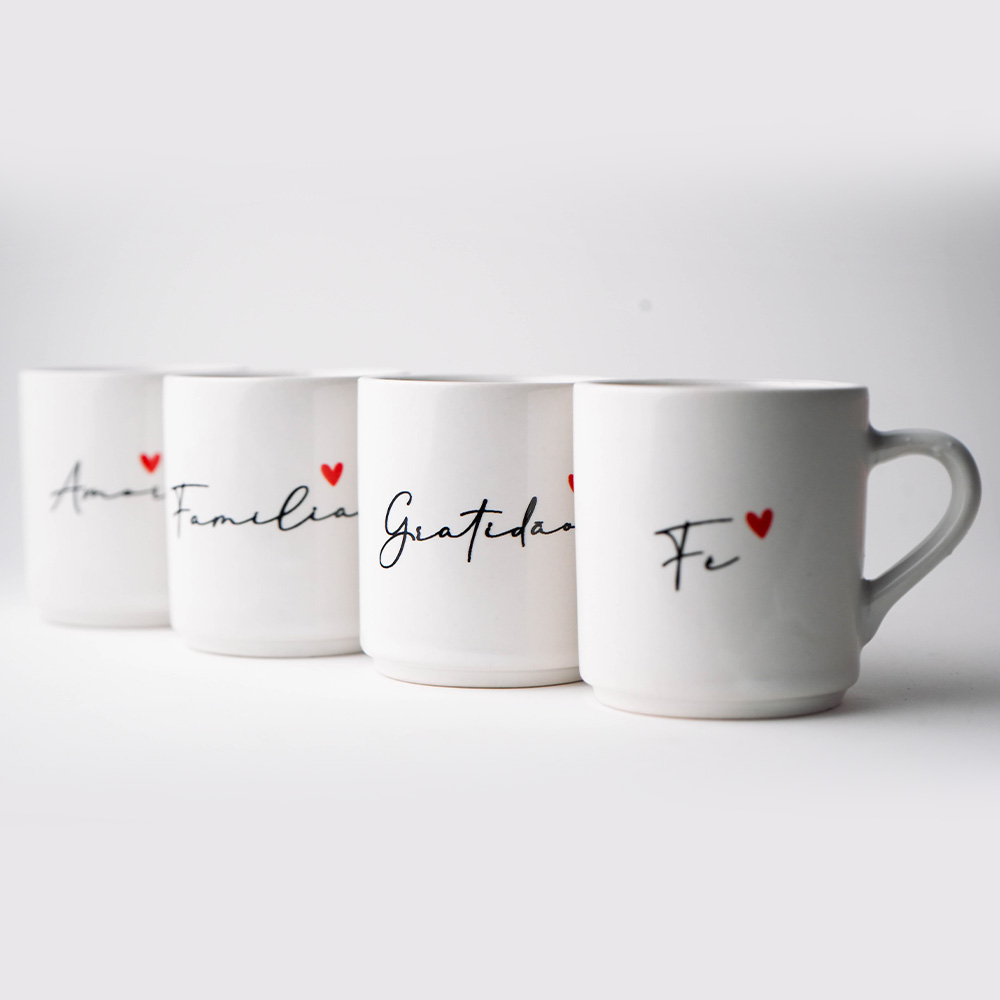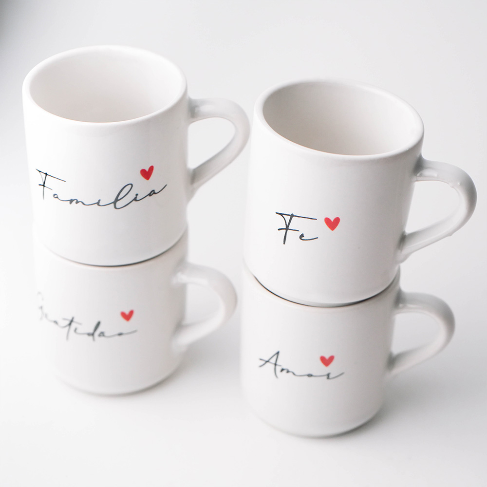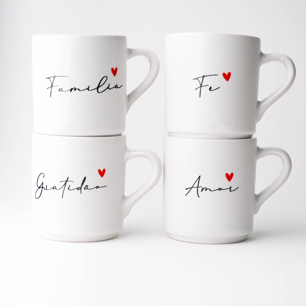 Coleção Quatro Amores: Kit com 4 mini canecas em cerâmica branca gravadas com as palavras Fé, Família, Amor e Gratidão. Acompanha 4 pires estilo pratinho multifuncional com espaço para biscoitos. Design clean com coração vermelho. O café com afeto que sua mesa merece!
