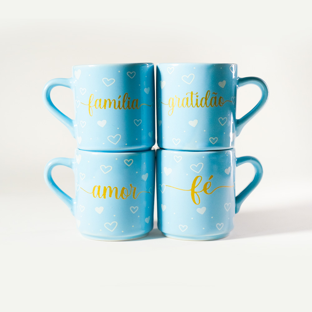 Kit “Dose de Sentimentos”: 4 mini canecas de 90ml em cerâmica azul claro (serenity). Decoradas com mini corações e as palavras: Fé, Família, Amor e Gratidão. A harmonia e a serenidade que o seu momento de café merece.