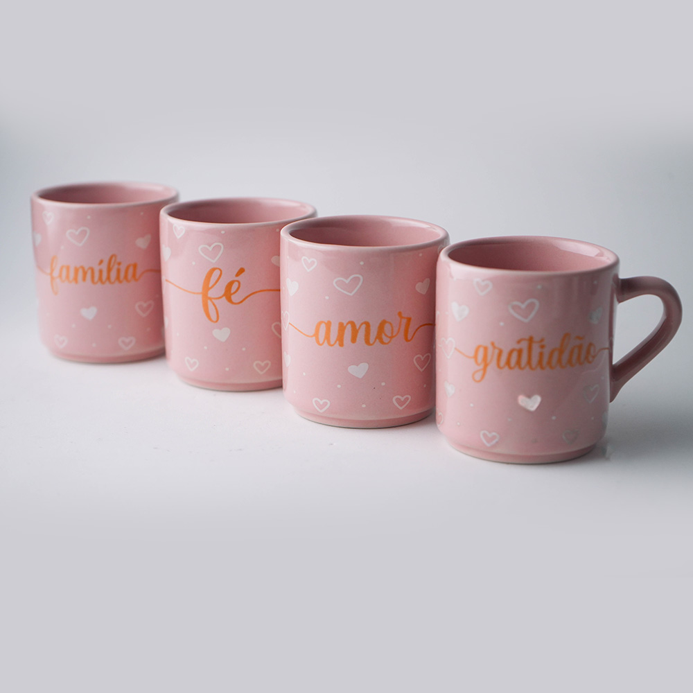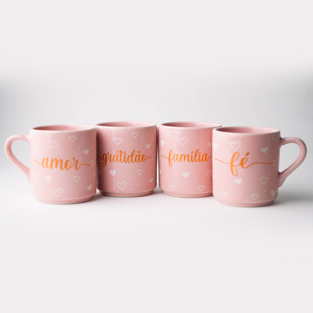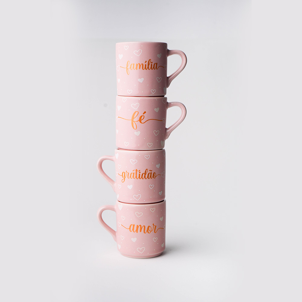 Kit “Dose de Sentimentos”: 4 mini canecas de 90ml em cerâmica rosa pastel. Decoradas com mini corações e as palavras: Fé, Família, Amor e Gratidão. O toque de doçura e inspiração que faltava no seu café expresso.