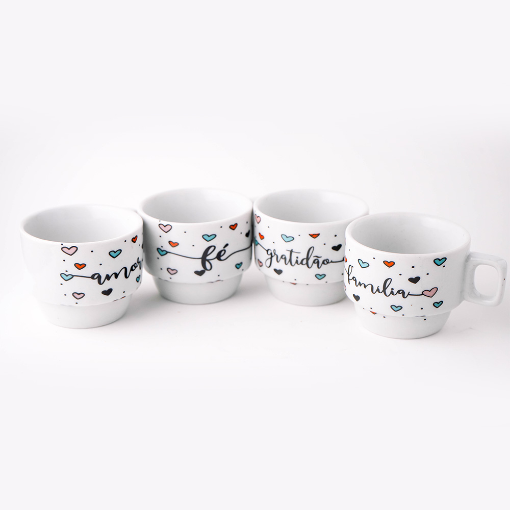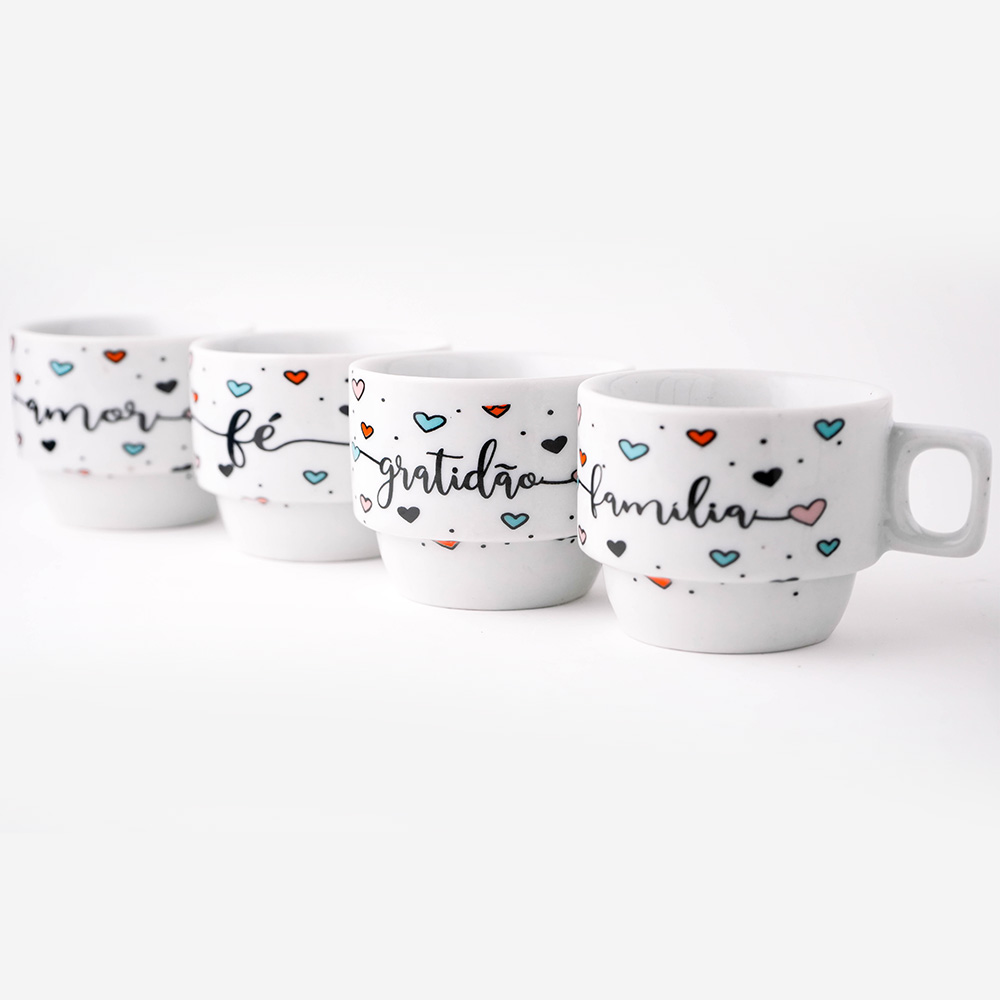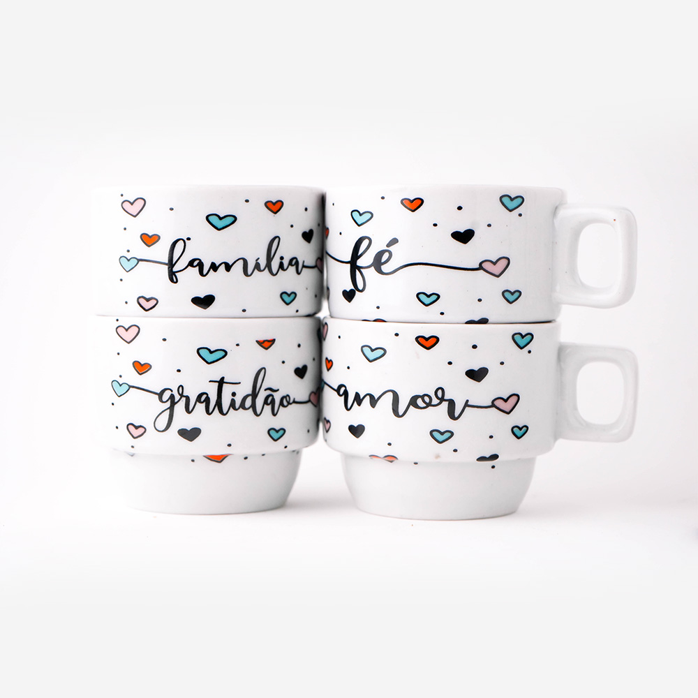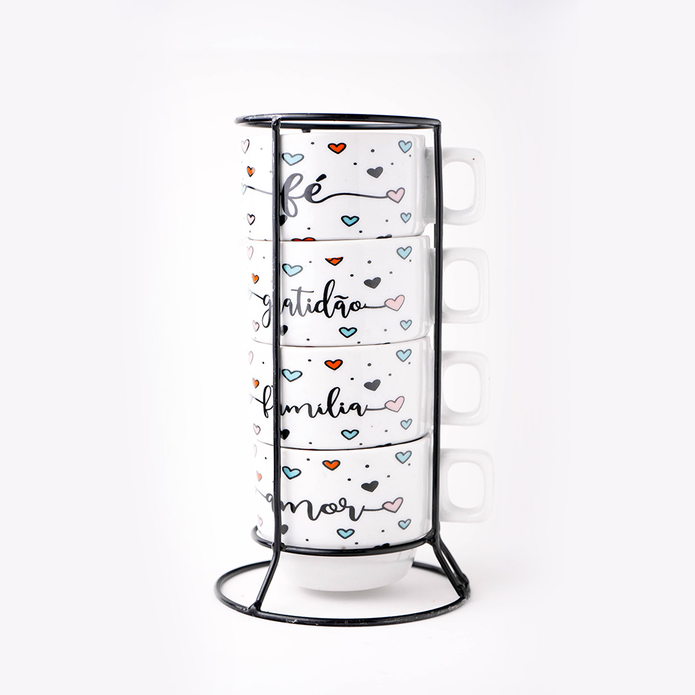 Kit “O Nosso Café”: 4 xícaras de chá em cerâmica com as palavras Fé, Família, Gratidão e Amor. Estampa exclusiva de corações coloridos em tons pastéis com contorno preto. Acompanha suporte vertical em metal para otimizar espaço e decorar com afeto.