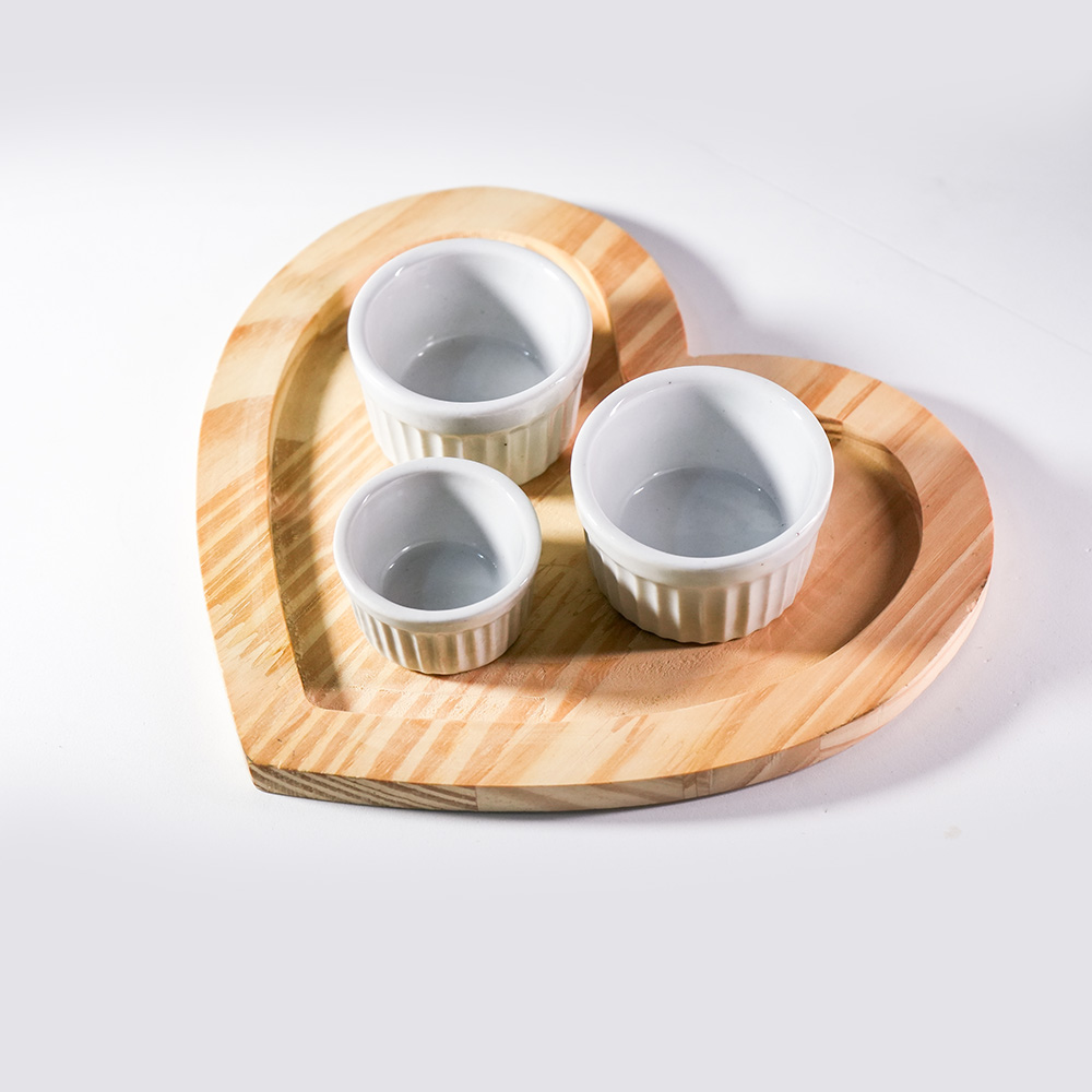 Kit “Trio Rústico & Afeto”: 3 ramequins em cerâmica branca (tamanhos PP, P e M) acompanhados de um suporte exclusivo em madeira natural no formato de coração. Versatilidade para servir molhos, petiscos e sobremesas com um toque artesanal.