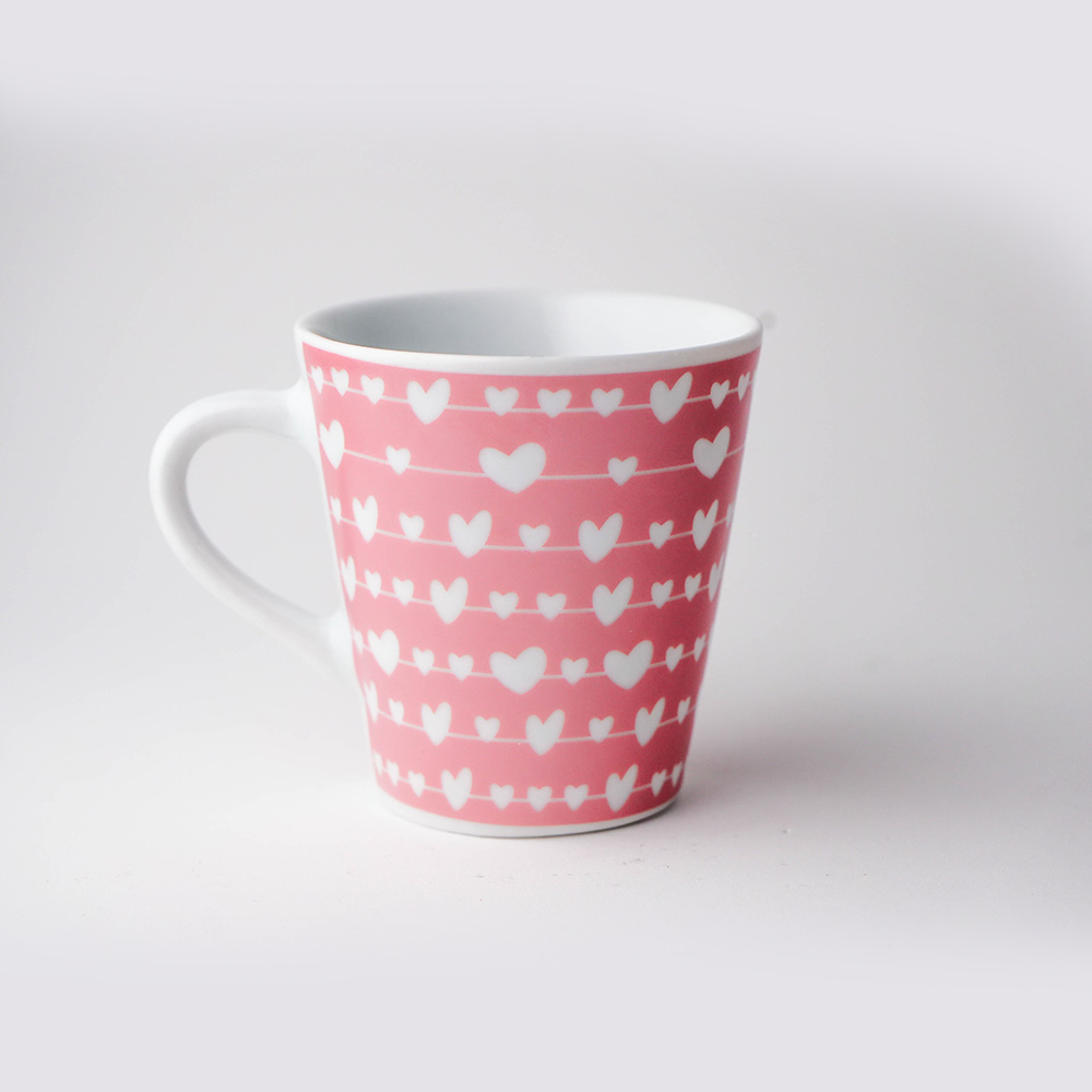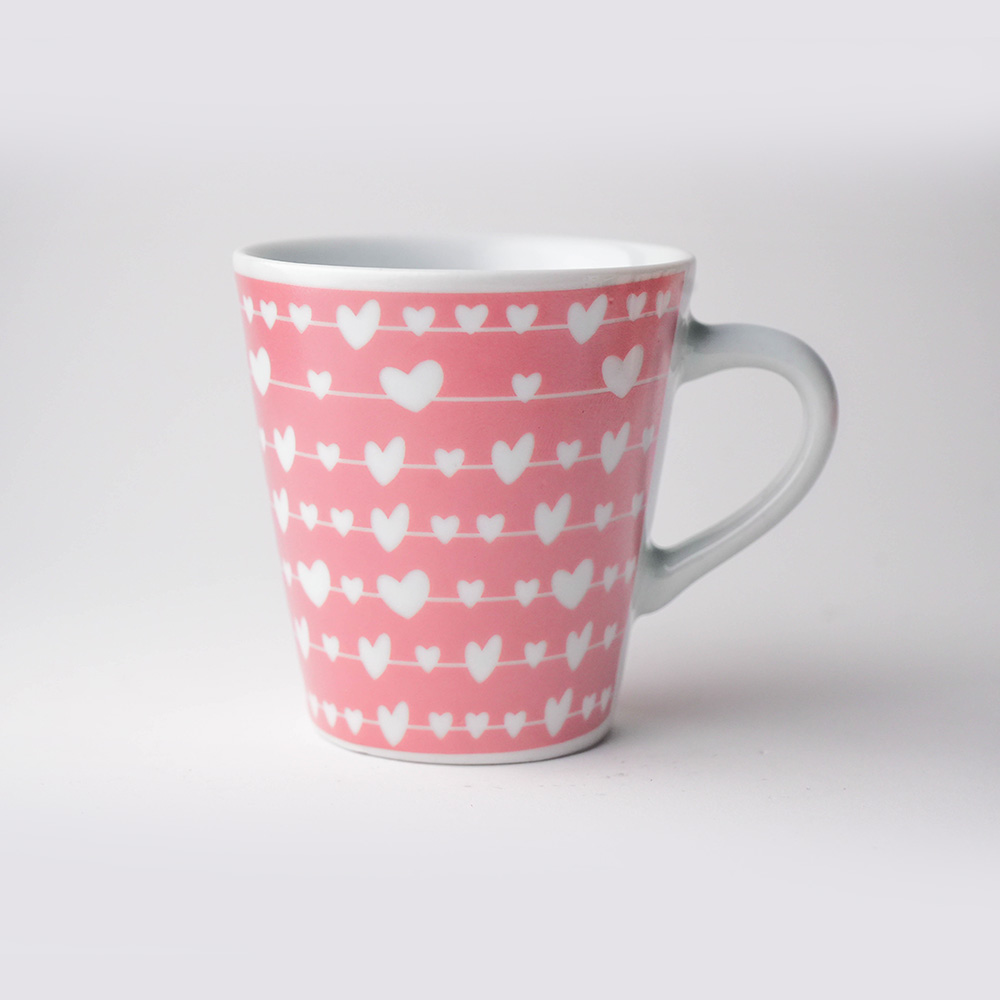 💕 Um Design que Abraça O destaque deste conjunto é a sua estética envolvente. Sobre uma base de cerâmica rosa suave, linhas horizontais brancas desenham um caminho onde pequenos corações brancos repousam delicadamente. O contraste entre o rosa do corpo e o branco da alça e do interior da caneca traz leveza e um acabamento impecável.