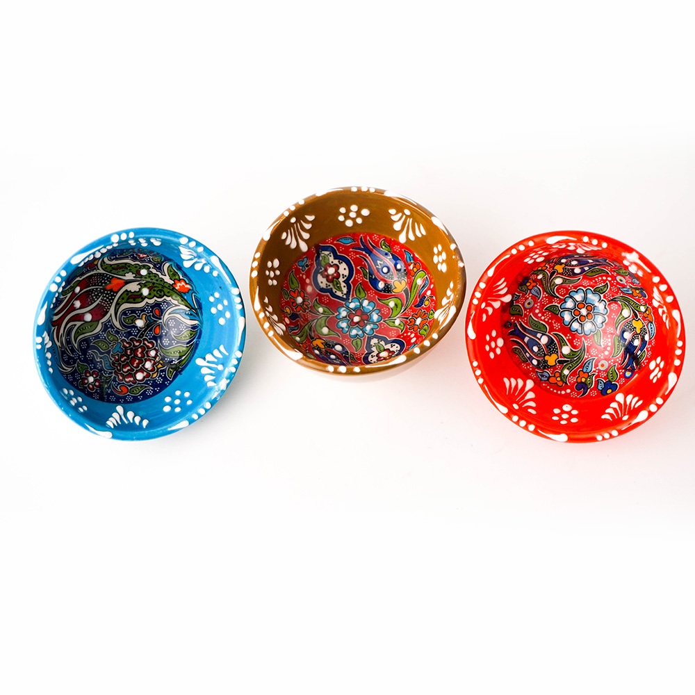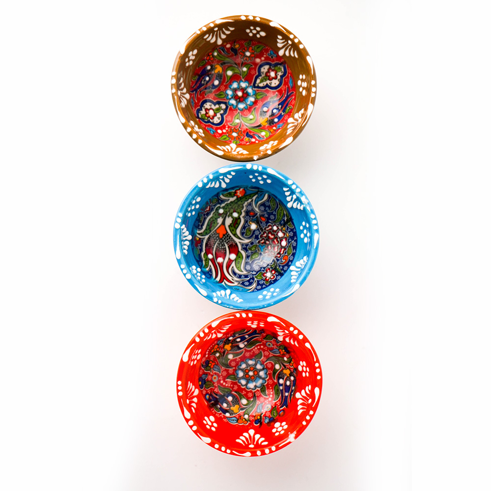 Kit Trio de Mini Bowls estilo Turco: 3 peças em cerâmica nas cores Azul, Marrom e Vermelho. Interior com estampa floral mandala detalhada e bordas com relevo. Ideal para servir petiscos, molhos ou como porta-joias decorativo.